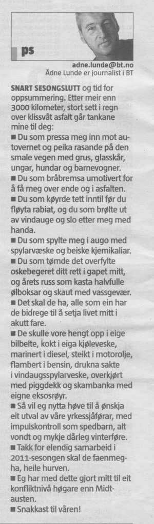 Jeg sykler en del til jobben og det er jo bra for meg og kjekt for miljøet sies det. Det skulle sikkert også stått i Bibelen, men han der faderen (eller far som han nå skal benevnes som og det er tatt search and replace på i denne verdens mest leste bok (påstår ihvertfall hallelujafolket)) hadde ikke regnet med det spetakkelet som foregår langs norske veier på morrakvisten, og litt utpå ettermiddagen en gang, i ukedagene. Eller det vil si også i de litt seine kvelder med fekting med tastatur i Bill Gates’ internett-boble og ofte med Steve Jobs’s fantastisk dyre og ofte totalt ubrukelige eplemerkede plastikk (jaja, den var subjektiv, men jeg forstår jo at det er vanskelig å innrømme for folk som har kjøpt driten – hadde jo ikke hatt noe eksklusivt å heve seg på da da…). For etter litt knuffing med en lav guard og et par uppercuts on the road, hamres det løs på nevnte tastatur på hjemmekontoret etter litt disputt med den såkalt bedre halvdel. Og det uten at delete tasten blir i nærheten av utslitt. Den ligger rett og slett litt langt fra der det skjer og fra fornuften.