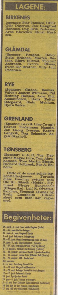 Men tilbake til det med gullaldre i norsk syklesport (da jeg var på toppen (eller kanskje helst midt i «mydlå» (i hodet i det minste…))). Vi hadde hardt satsende lag på slutten av sytti-tallet og begynnelsen av åtti-tallet (før jappekrisa (jeg kaller det det, men det heter nok i dagens terminologi finanskrise, og jappetida (inkludert børstraktorer), med boligkrakk og børshaier som fikk det tøft med å ha råd til mat på saltet). Jeg har noen utklipp fra VG i 1979 som speiler dette ganske godt. Selv om jeg selv husker godt fra den tida vil nok mange i sykkelmiljøet dra kjensel på mange navn her: